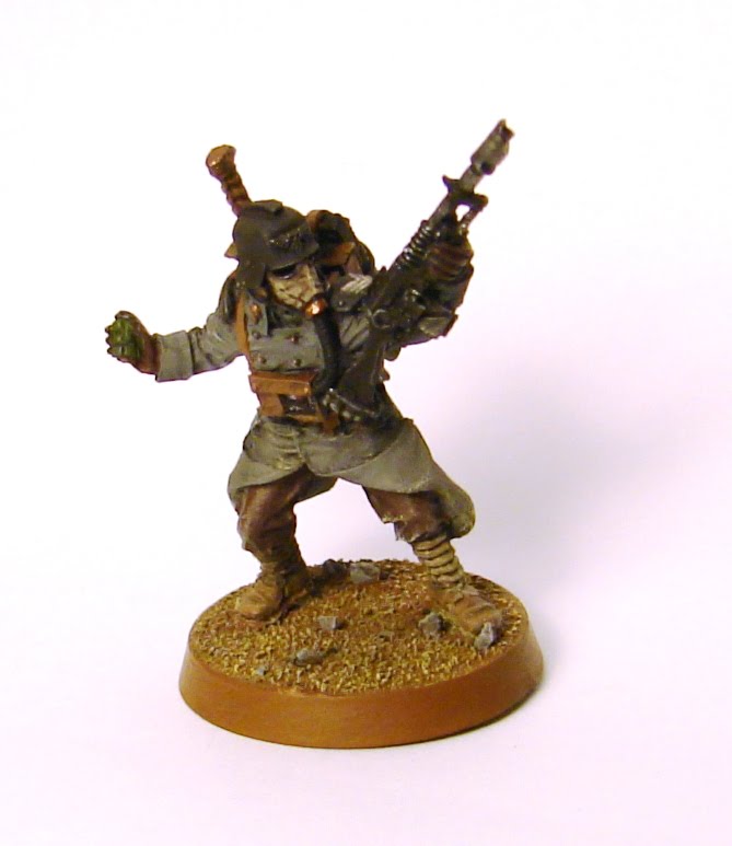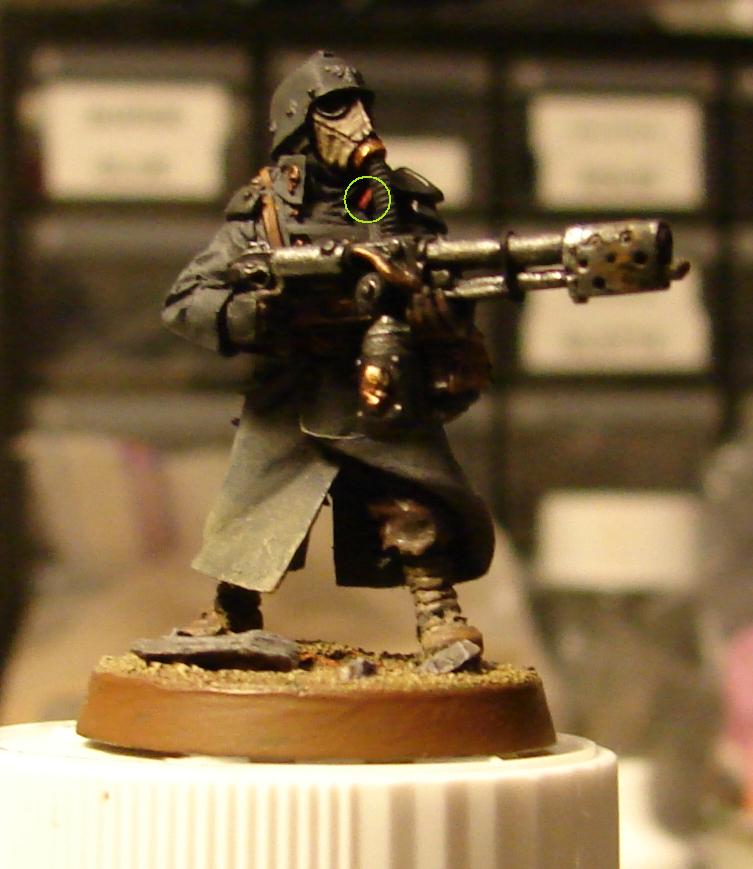 Gas mask was given an additional highlight of GW Kommando Khaki. Hose connected painted GW Brazen Brass, and highlighted with GW Shining Gold. Eyepiece rims edged in VMC Oily Steel. Lenses left black. Hose drybrushed with GW Codex Grey
