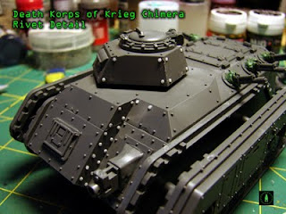 However, being Krieg, I thought I should make a few minor conversions to the Chimeras to reflect the nature of the army they serve in. Yesterday, I posted about the port firing lasgun covers, and today I've got more to show.