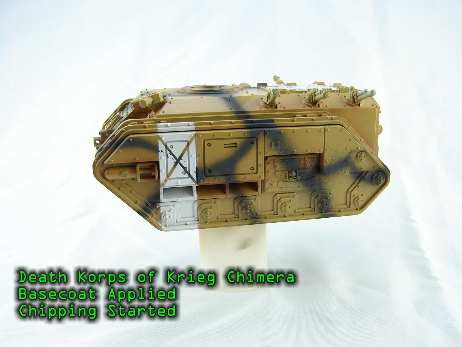 Why pictures of my basecoated Leman Russ WIP? Well, I cringe to say this, but I'm going to pull another hobby "flip flop" and resume work on my Death Korps of Krieg. I'm really excited about the recent DVD tutorials I've watched, and I've got an idea for a DKoK "Missile Launcher" in the works as well.